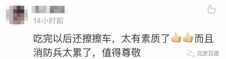 6月18日,西安某隊消防員一早出警忙到下午沒顧得上吃午飯,隊長買來泡面給大家充饑。因車?yán)镒幌?,一名消防員只得趴在一輛私家車引擎蓋上吃。還沒吃完泡面,這位消防員就被隊友提醒:要抓緊時間繼續(xù)工作了。匆匆收好泡面盒子后,他竟用自己的衣服仔仔細(xì)細(xì)將引擎蓋擦拭干凈。