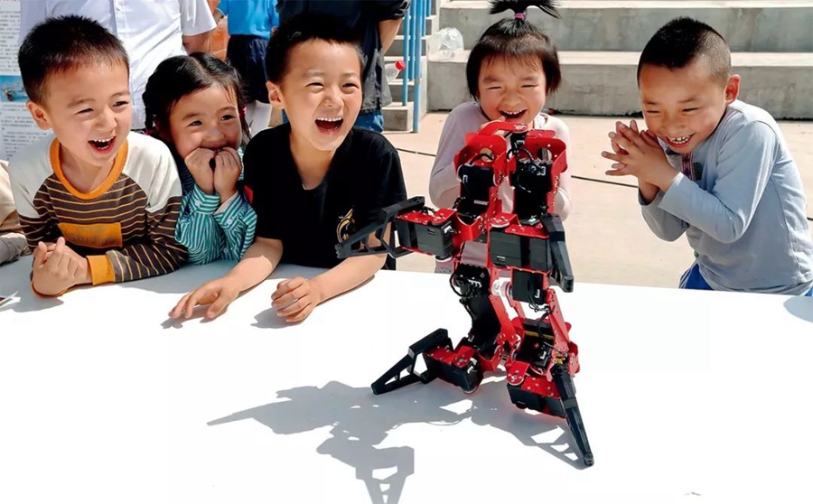5月24日,幼兒園小朋友在甘肅省平涼市科技活動周“科技大篷車”主題活動上被一款機器人科普展品吸引 楊昕攝