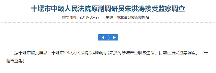 據(jù)十堰市監(jiān)委消息:十堰市中級人民法院原副調(diào)研員朱洪濤涉嫌嚴(yán)重職務(wù)違法,目前正接受監(jiān)察調(diào)查。(十堰市監(jiān)委)