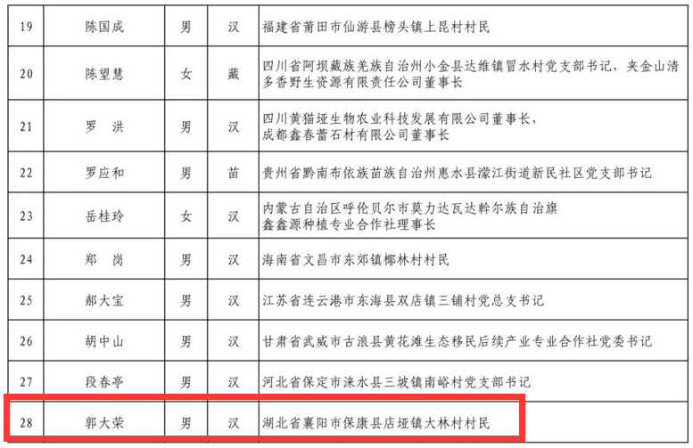 入選奮進獎的湖北省襄陽市保康縣店埡鎮大林村村民郭大榮、咸寧市崇陽縣白霓鎮大市村黨支部書記程桔。