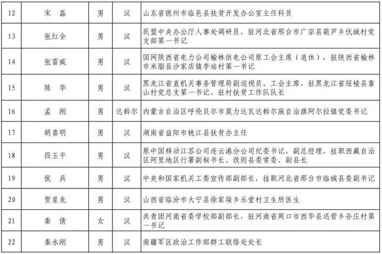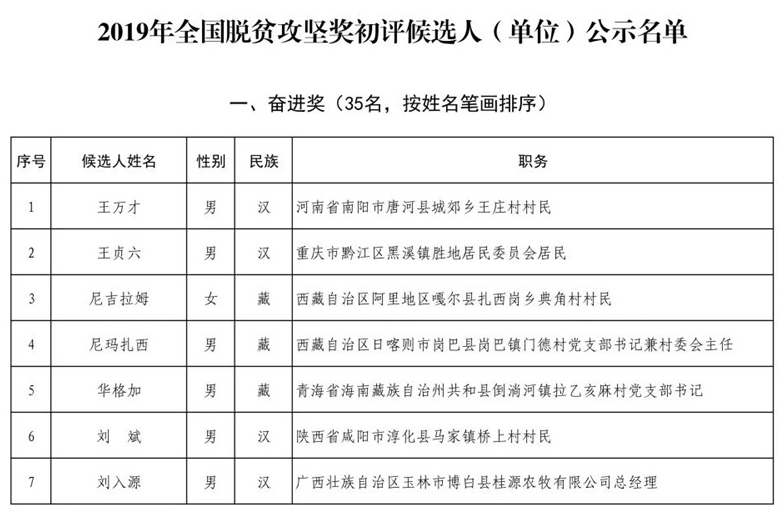 荊楚扶貧網消息 6月28日,從國務院扶貧開發領導小組辦公室網站獲悉,根據國務院扶貧開發領導小組印發的《2019年全國脫貧攻堅獎評選表彰工作方案》,經全國脫貧攻堅獎評選委員會初次評審,共有140名人選和59個單位作為2019年全國脫貧攻堅獎初評候選人(單位),現予以公示。