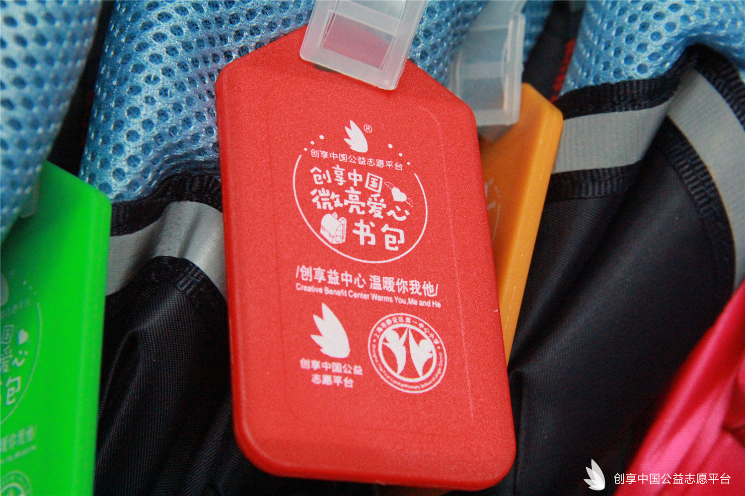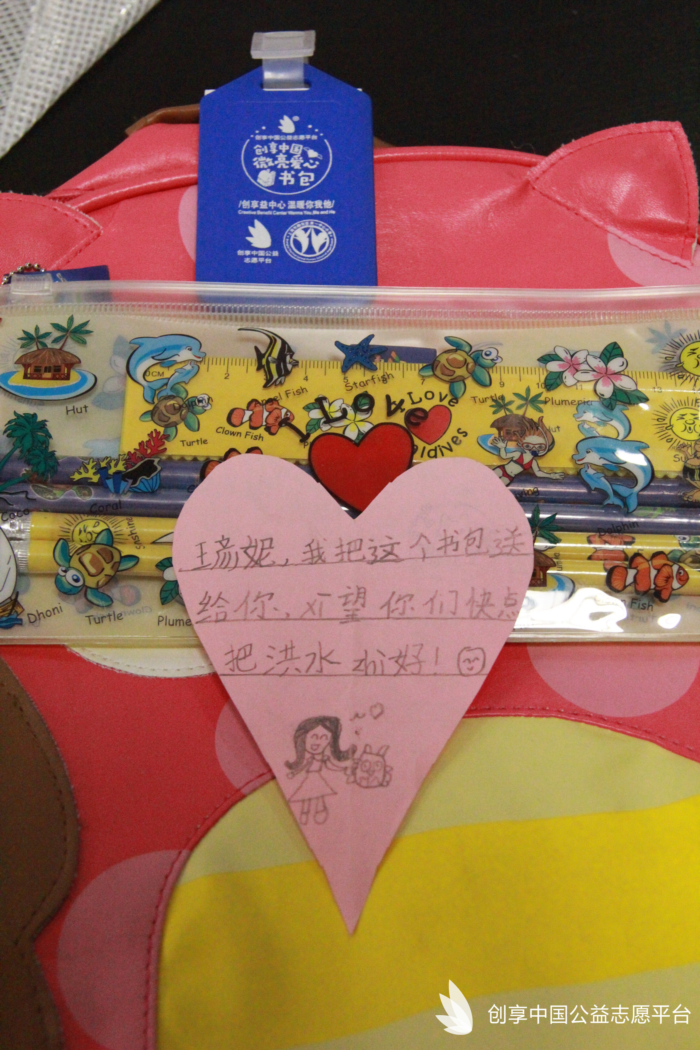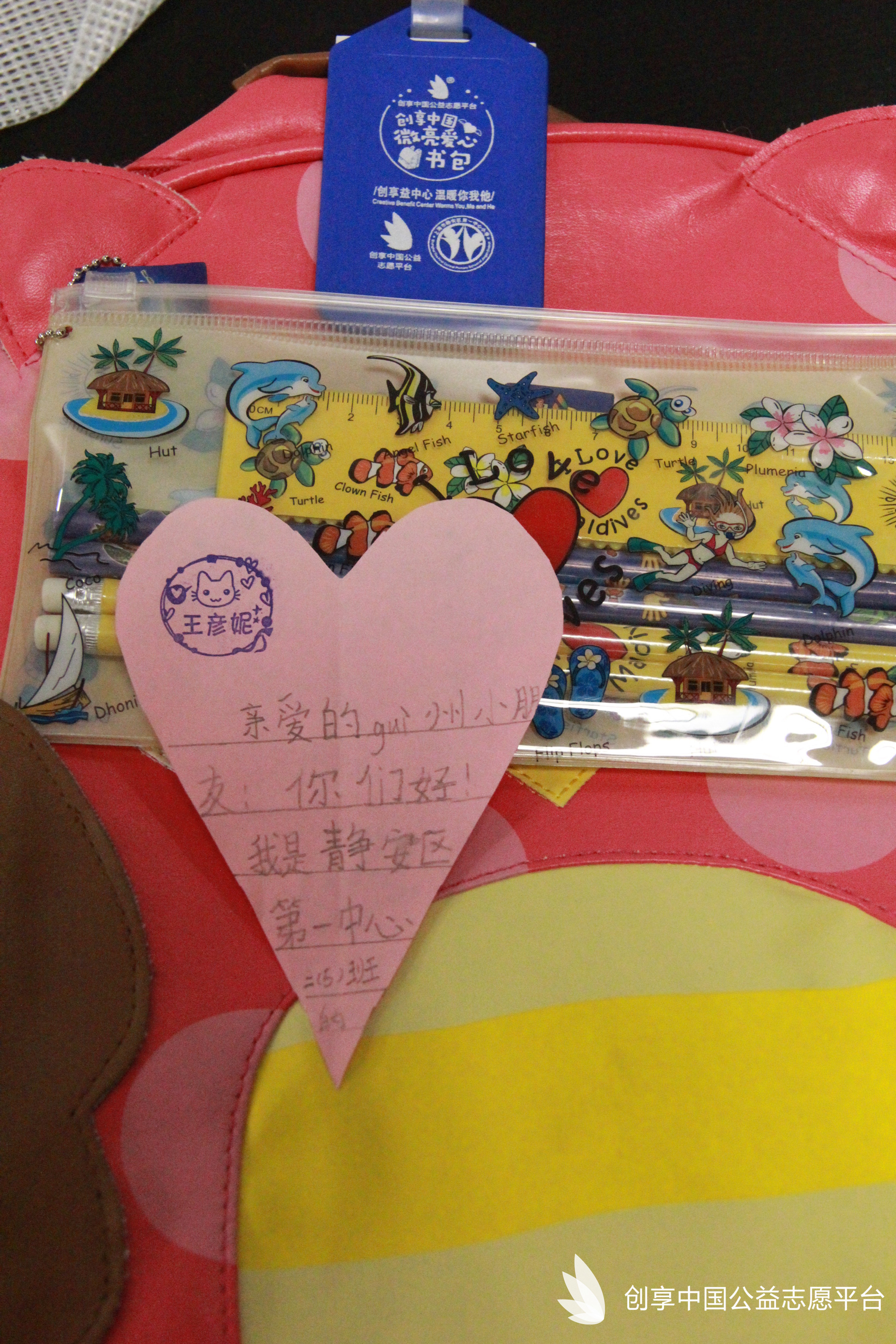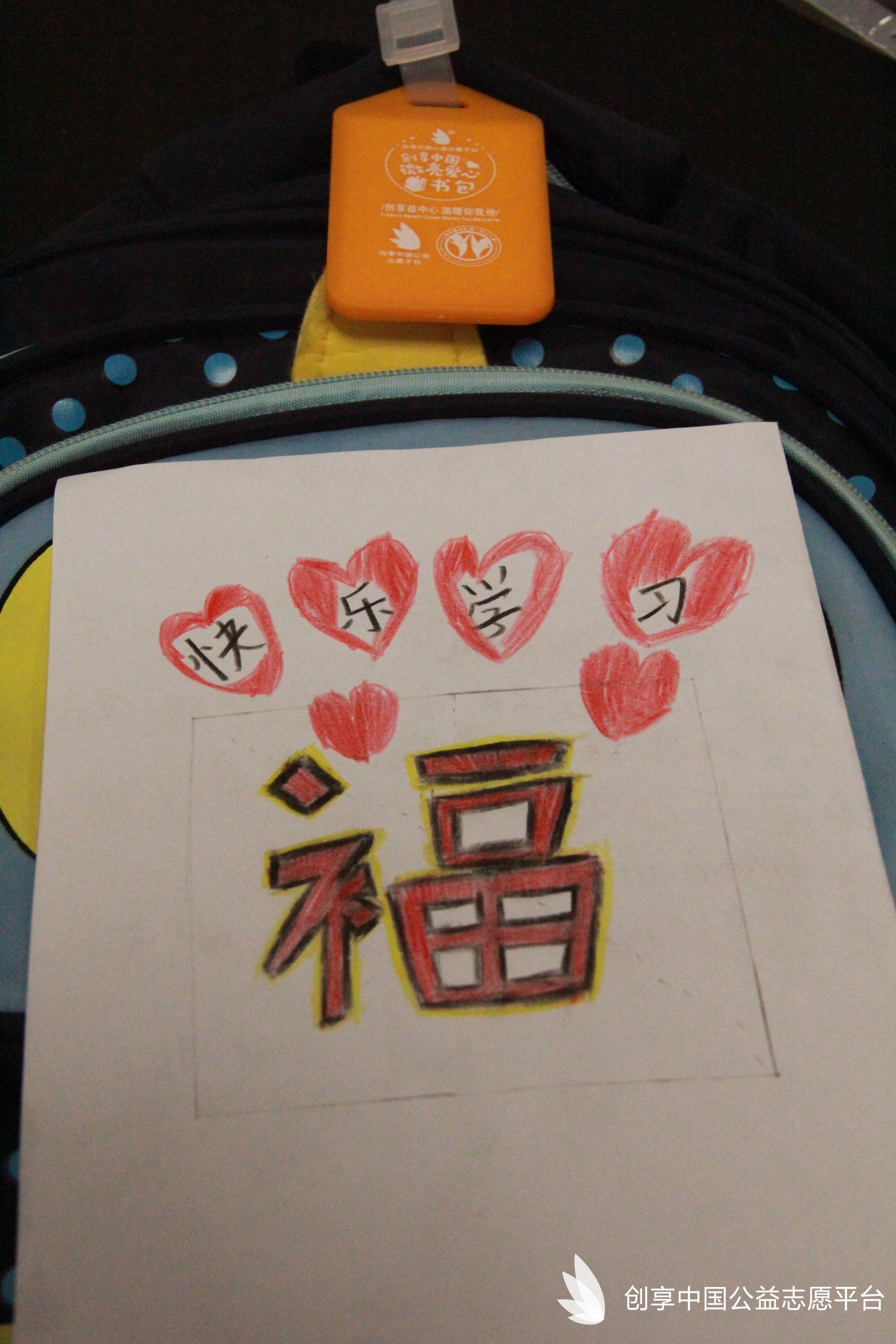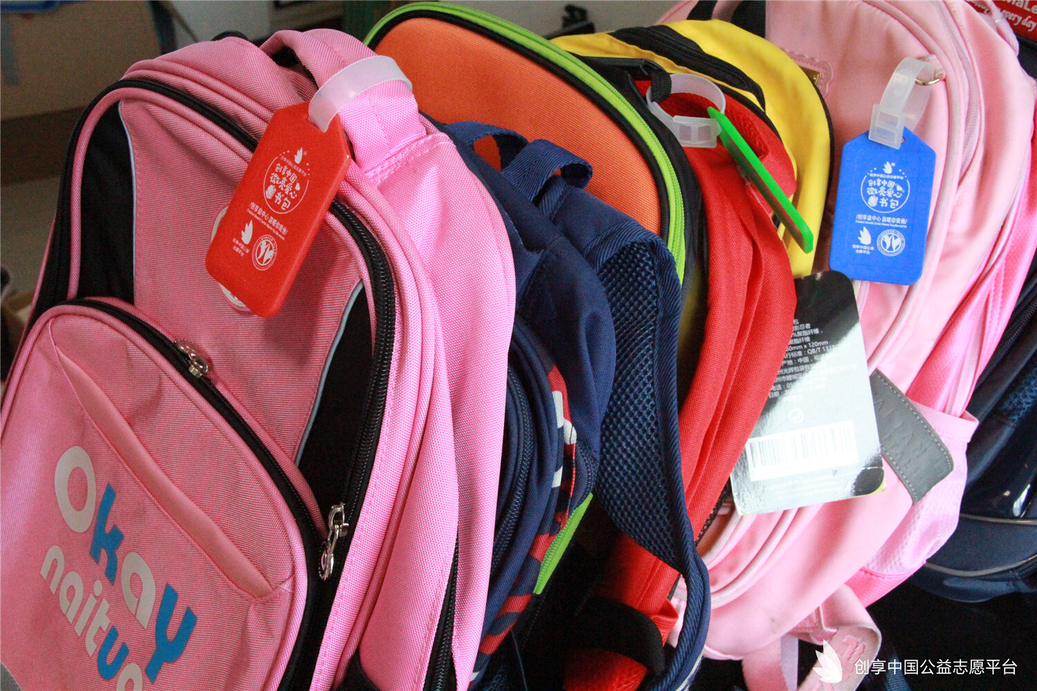 我們特別為災區同學們定制了可以填寫個人信息的愛心吊牌,同時也為每個書包配備了一個記事本一雙愛心襪。