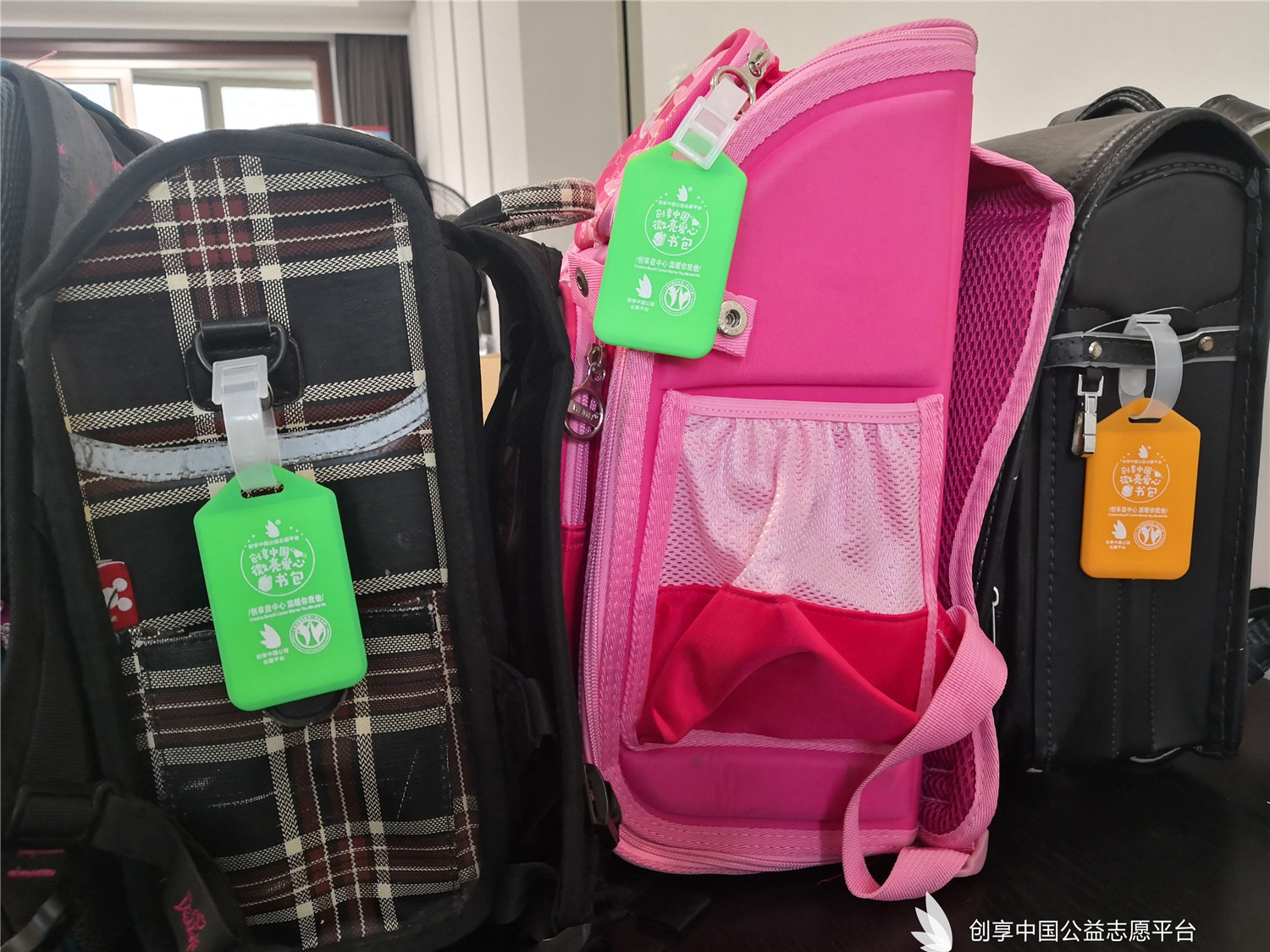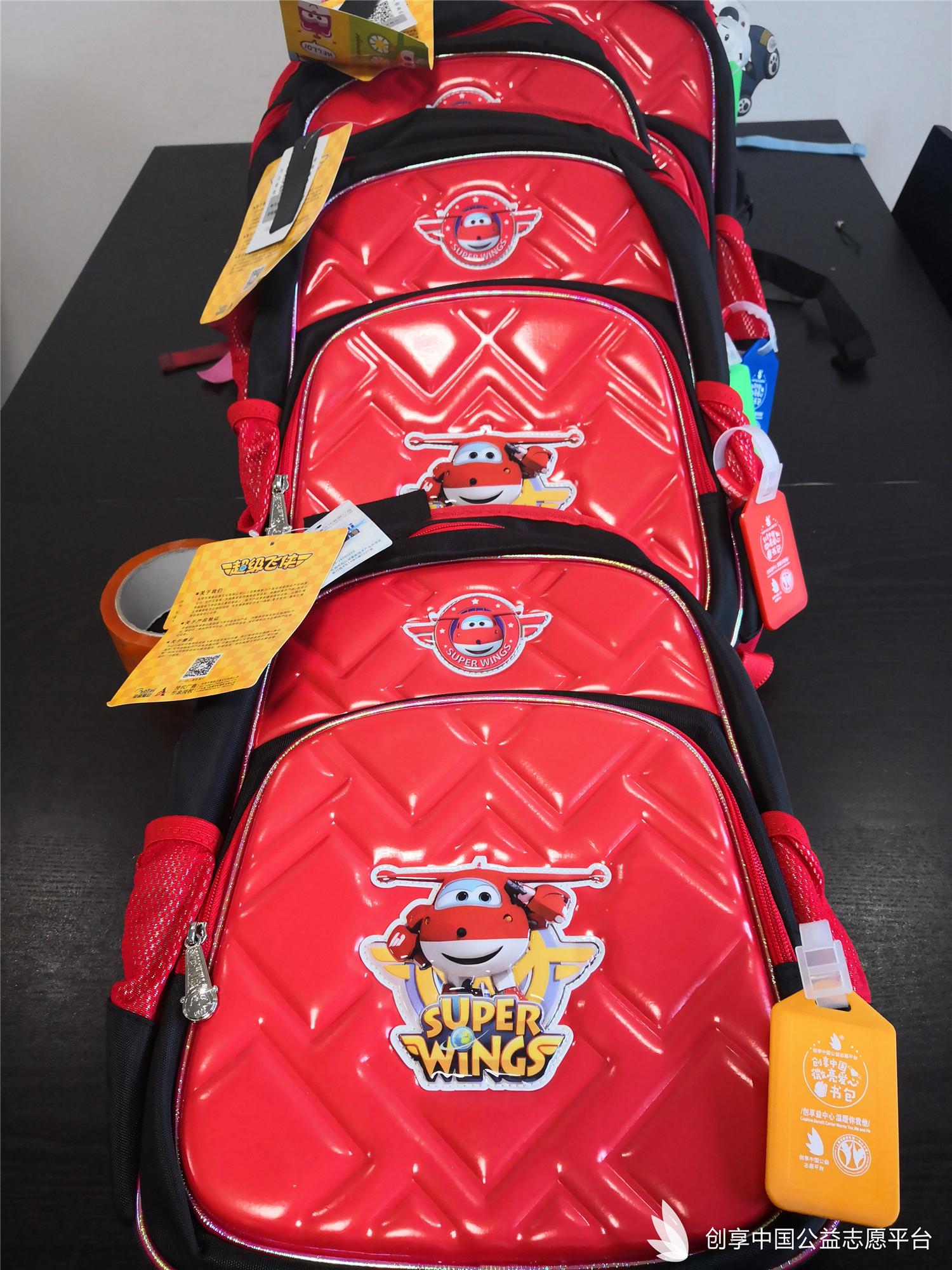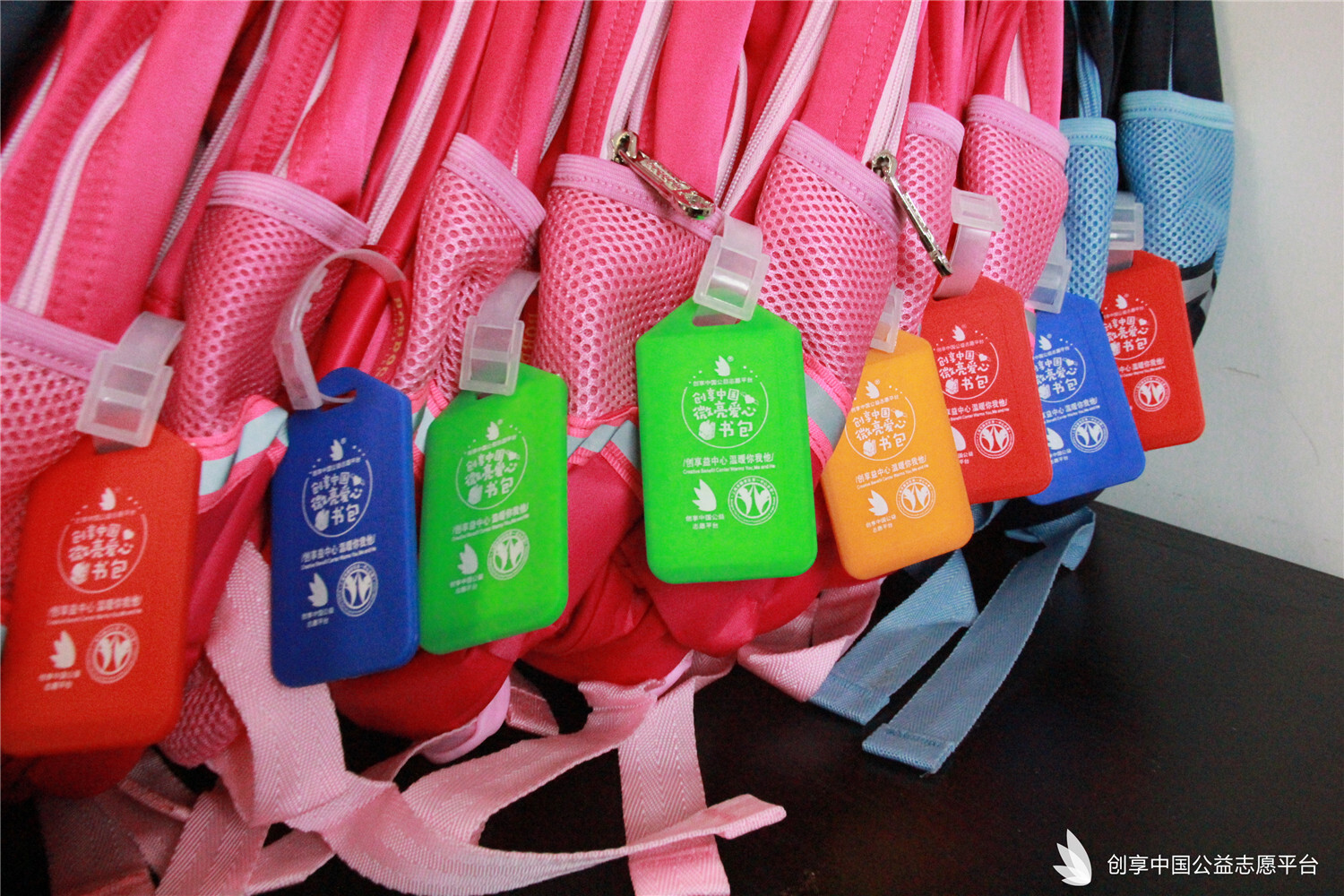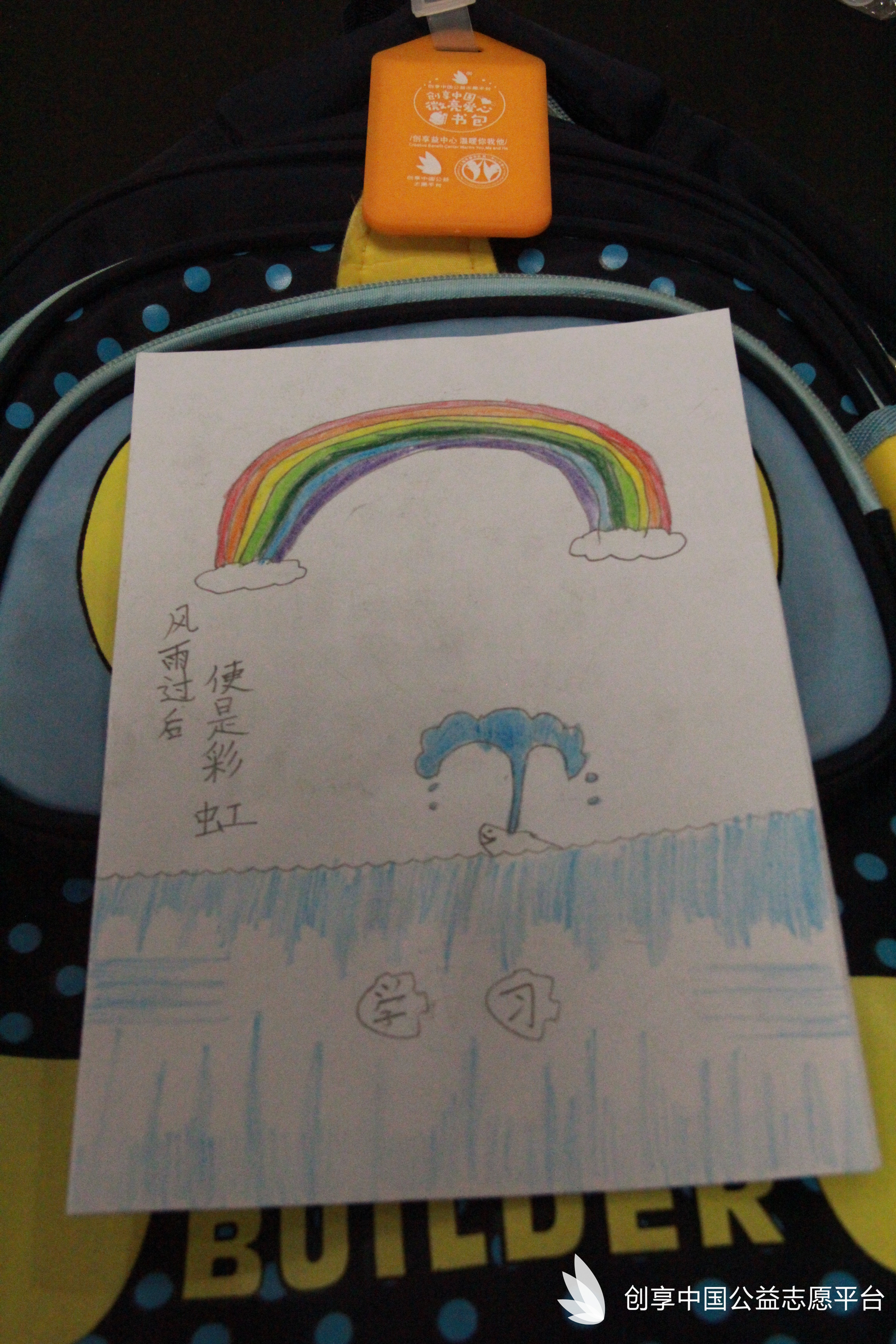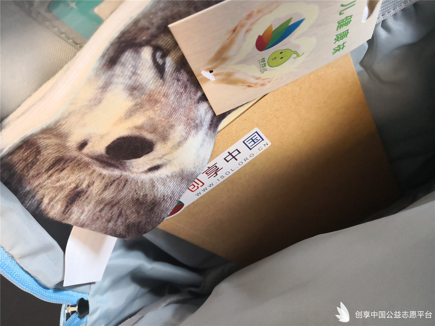 我們特別為災區同學們定制了可以填寫個人信息的愛心吊牌,同時也為每個書包配備了一個記事本一雙愛心襪。