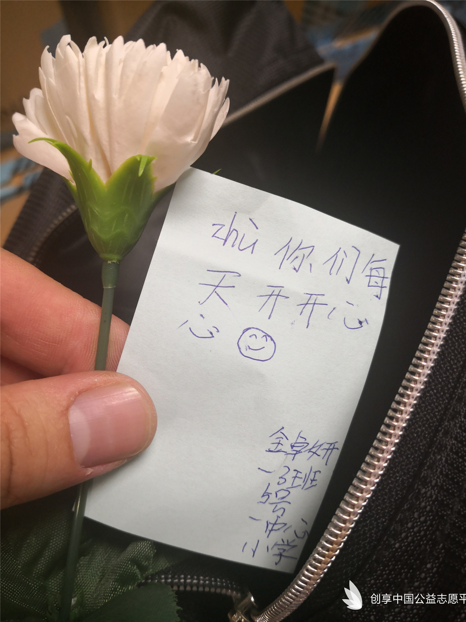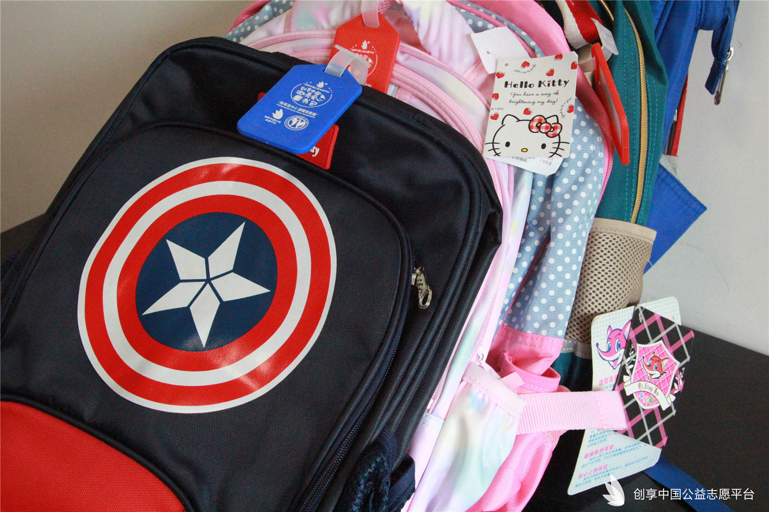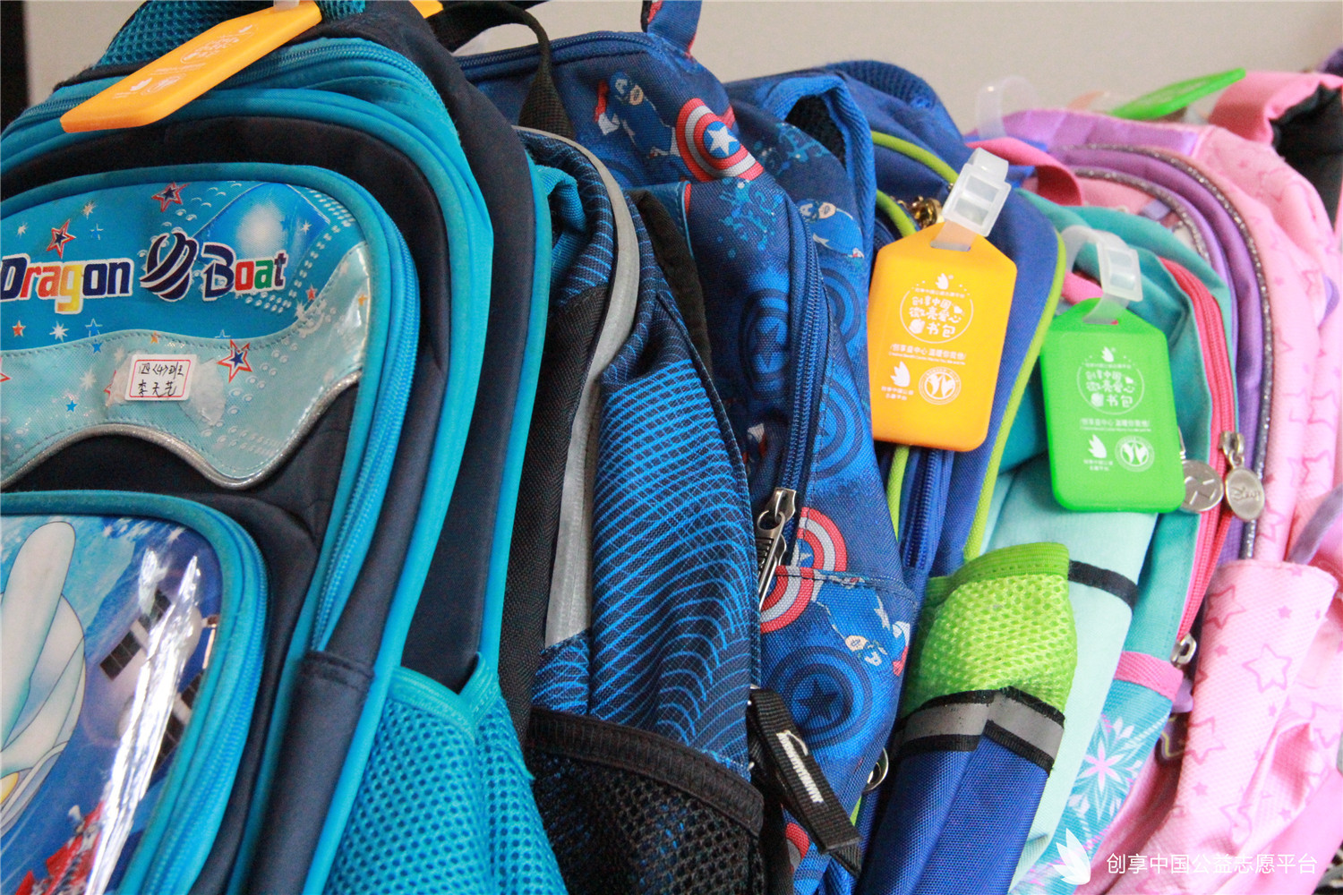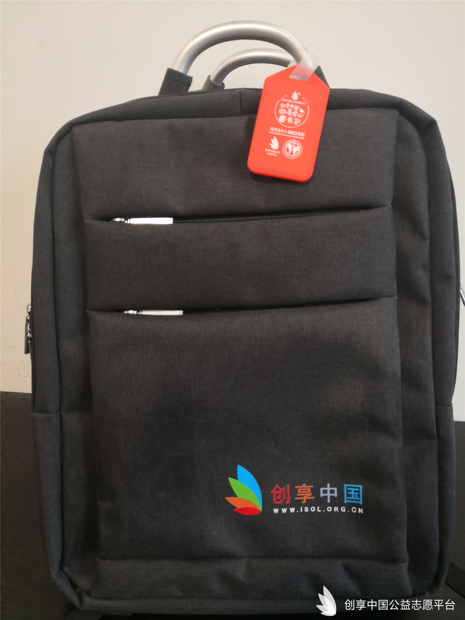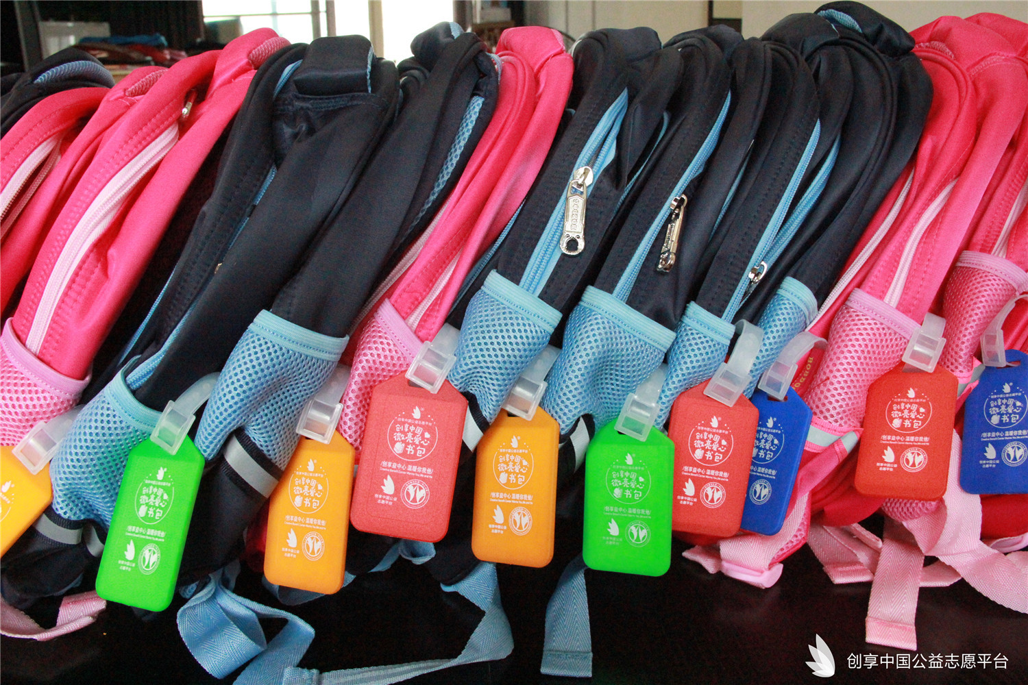 我們特別為災區同學們定制了可以填寫個人信息的愛心吊牌,同時也為每個書包配備了一個記事本一雙愛心襪。