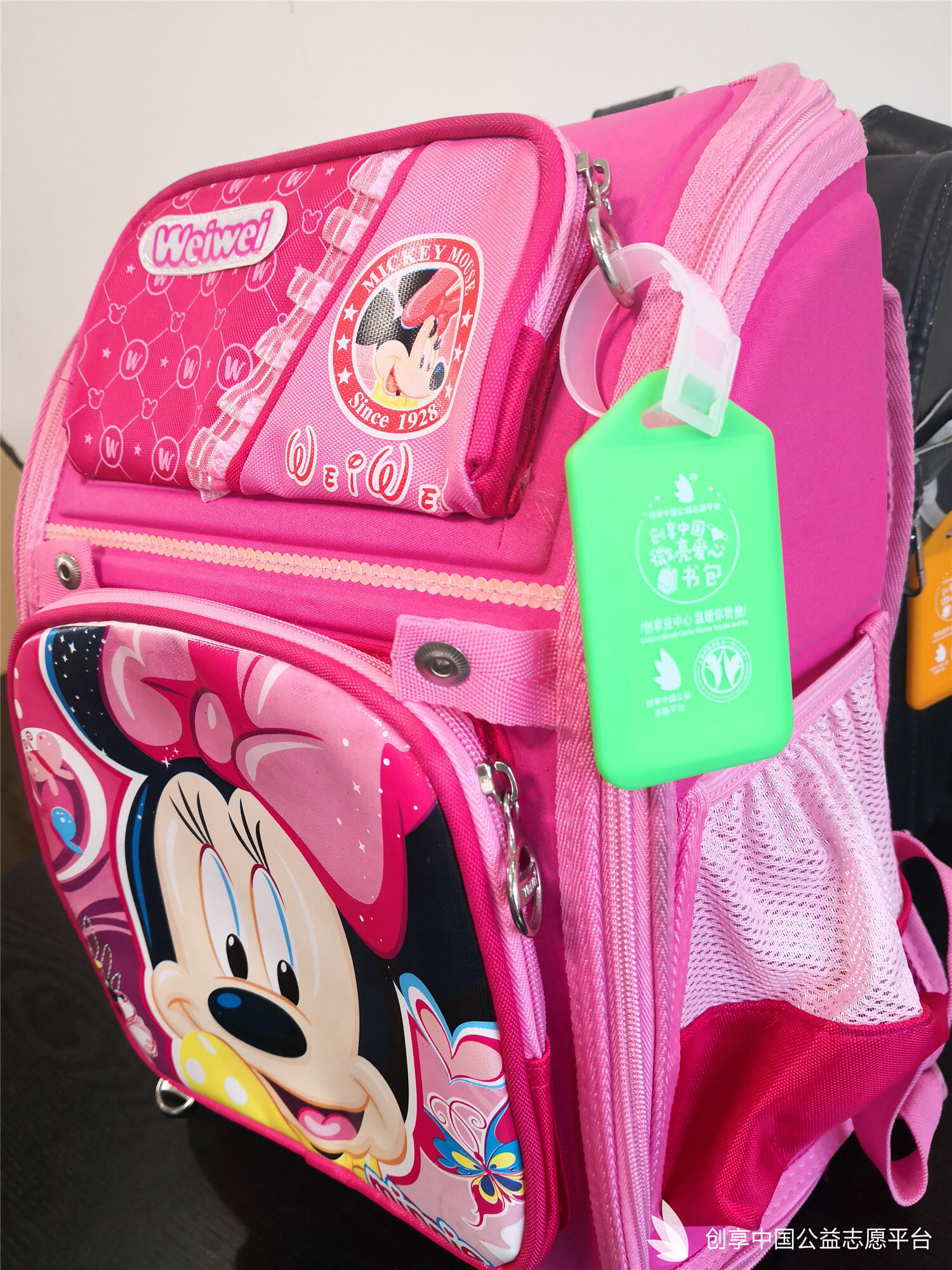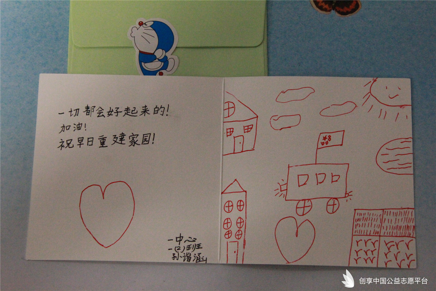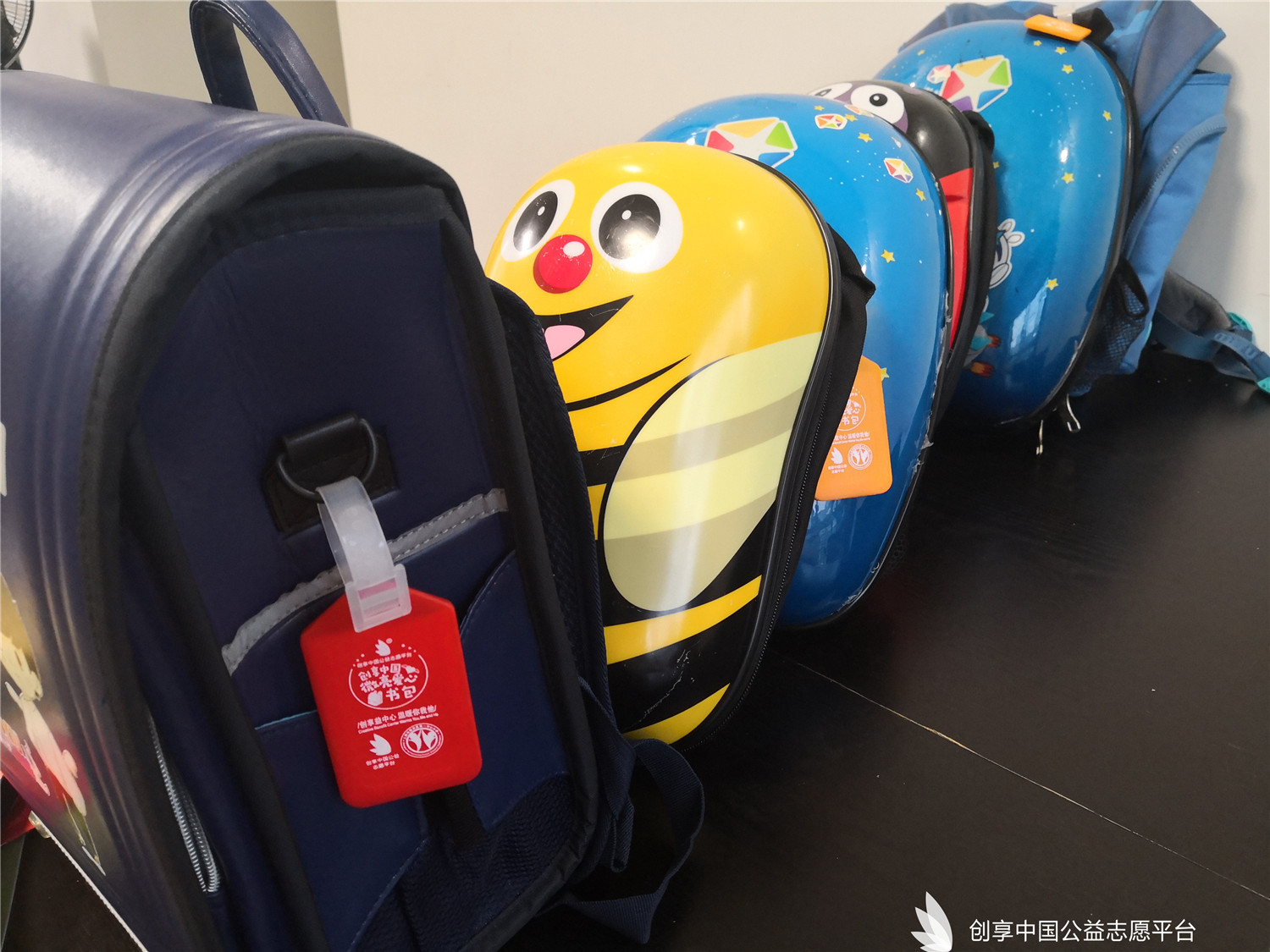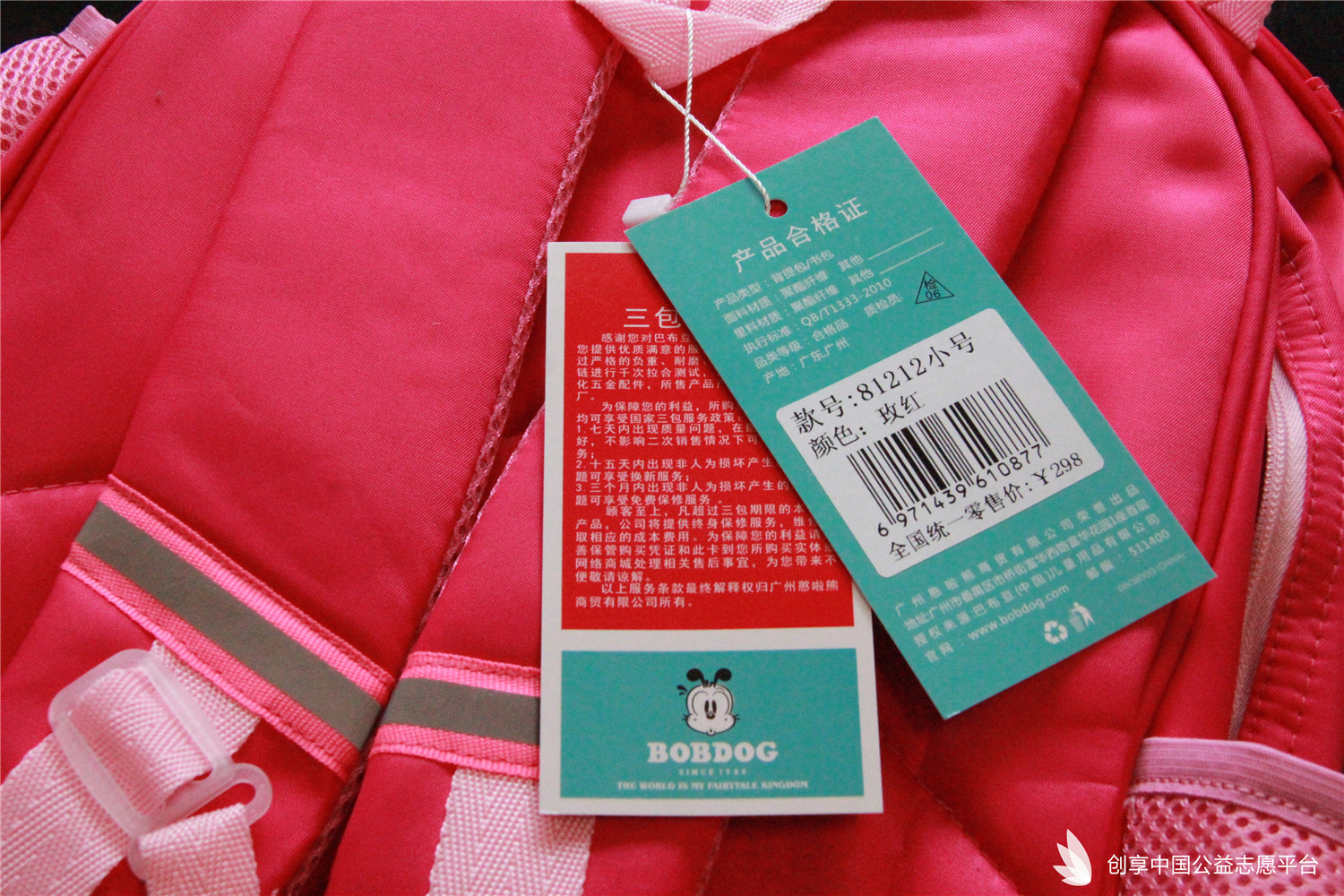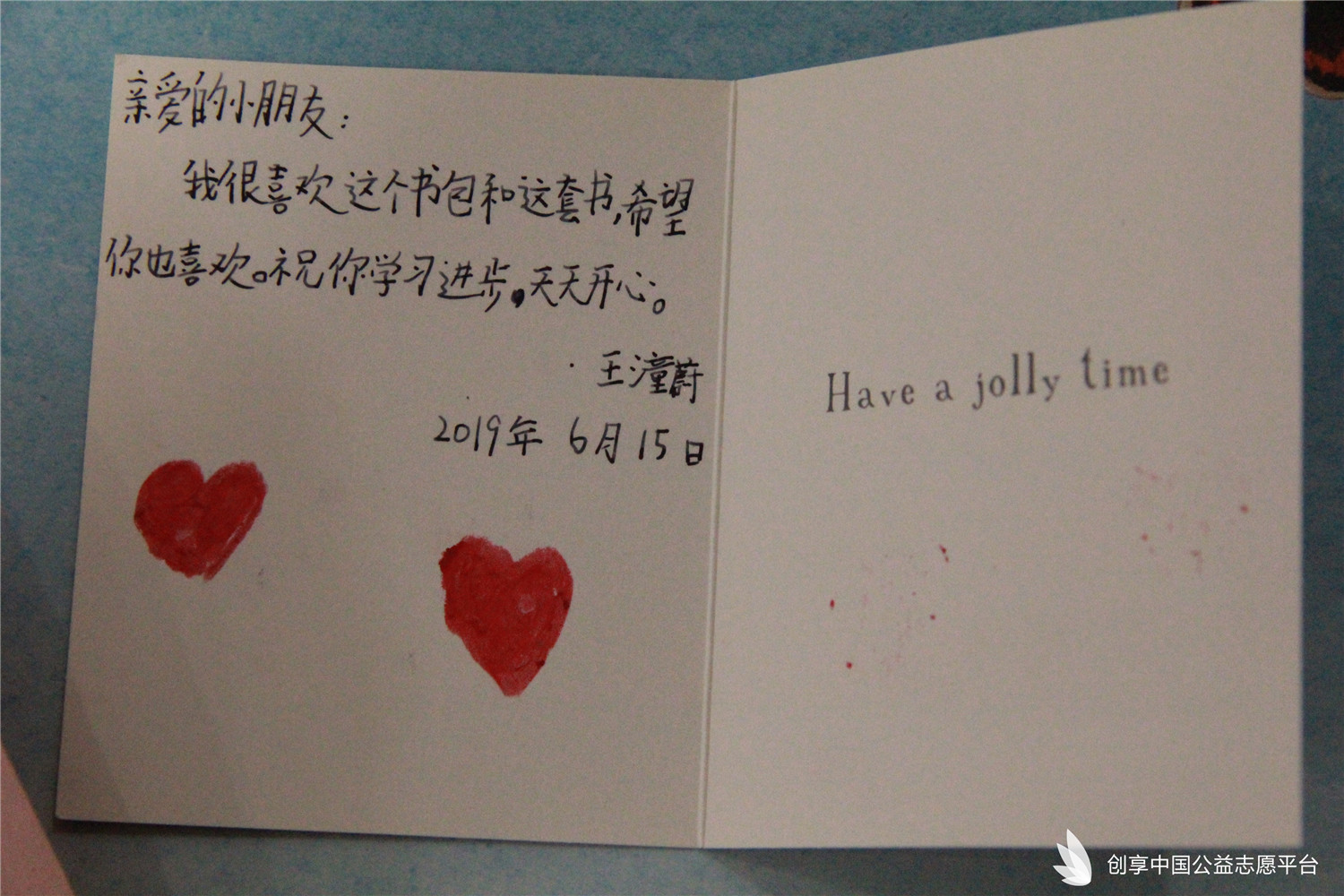 我們特別為災區同學們定制了可以填寫個人信息的愛心吊牌,同時也為每個書包配備了一個記事本一雙愛心襪。