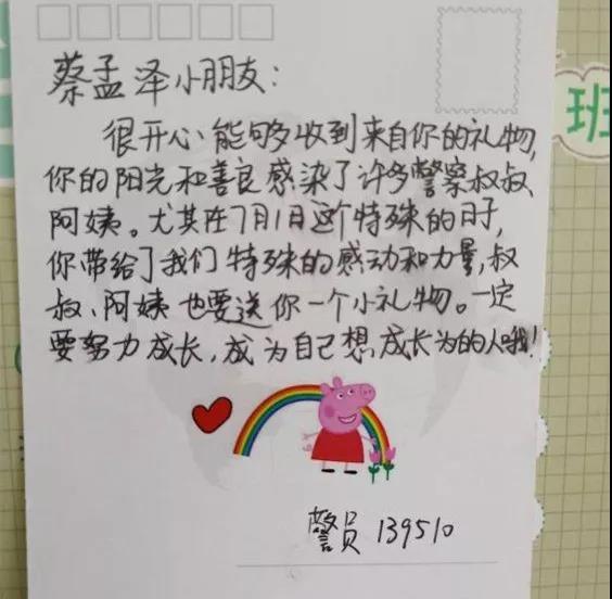 為了感謝這位小朋友的暖心舉動(dòng),給他鼓勵(lì)加油,昨天下午民警輾轉(zhuǎn)聯(lián)系到了男孩母親張女士,并親自到小男孩家。同時(shí),給小男孩也帶去特殊的“禮物”,一個(gè)警察玩偶和一張寫滿鼓勵(lì)話語的明信片。