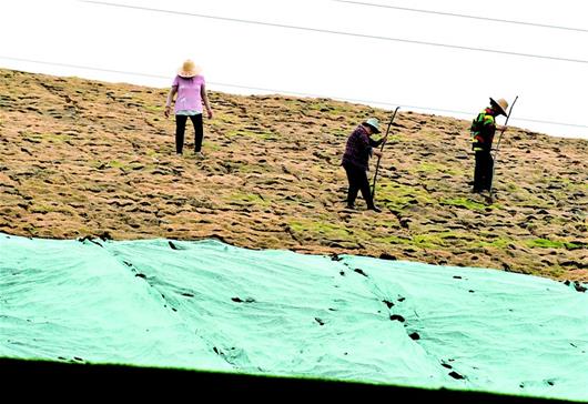 圖為2019年5月16日,工人在北洋橋垃圾填埋場(chǎng)鋪設(shè)草皮