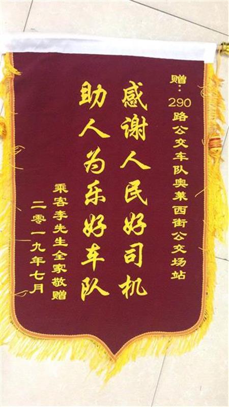 李先生立刻前往奧特萊斯公交場站290路站房尋找女兒,當班站長楊順佳了解情況后主動伸出援手,在多位駕駛員的幫助下,小女孩順利回到了父親李先生身邊。7月3日李先生將一面印有“感謝人民好司機,助人為樂好車隊”的錦旗送到290路站房答謝公交師傅們的幫助。