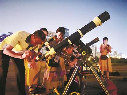 記者在專業(yè)的天文望遠(yuǎn)鏡里看到,明亮的土星外面有一圈光環(huán),看上去就像一頂草帽,在土星的不遠(yuǎn)處,則是看起來更明亮的木星。“此次土星沖日天象的另一個(gè)看點(diǎn)就是木星,視亮度將達(dá)到負(fù)2.5等,不僅比視亮度只有0.1等的土星明亮,比全天夜空中最亮的恒星天狼星都要亮。”阮光友說,木星的自行速度比土星快,木星將在2020年下半年追上土星,屆時(shí)夜空將上演30年一遇的土木相合。“土星非常漂亮,親眼看到,比照片更讓人覺得真實(shí)美麗。”星光之友團(tuán)隊(duì)的七八名隊(duì)員一邊幫忙調(diào)試設(shè)備,一邊跟觀測的市民解說著天象的產(chǎn)生原因,不少市民還嘗試自己動手尋找夜空里的其他星星。“我們特意選擇這個(gè)地方進(jìn)行路邊觀測,這里平臺比較大,相對暗一點(diǎn),方便觀測。”星光之友志愿者趙明告訴記者,團(tuán)隊(duì)成員都是天文愛好者,13年來,經(jīng)常在一些重大或有意思的天象發(fā)生時(shí),組織這種“路邊天文夜”公益觀測活動,讓更多人認(rèn)識和了解天文知識,培養(yǎng)出了四五十名發(fā)燒友,經(jīng)常一起相約追星。“土星與地球的會合周期為378天,也就是說,幾乎每年都有“土星沖日”天象發(fā)生,下一次將出現(xiàn)在2020年7月21日。”湖北省天文學(xué)會理事、黑龍江省天文協(xié)會副理事長孟憲有提醒市民,本月內(nèi),土星距離地球都很近,整夜可見,都是觀測的好時(shí)機(jī)。7月17日凌晨還將發(fā)生一次月偏食,我國范圍內(nèi)可見,武漢等湖北境內(nèi)可看帶食月落有趣景觀。