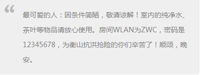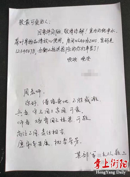 教師周文不僅整理好房間給武警官兵休息,還留下紙條:“室內的純凈水、茶葉等物品請放心使用。房間WLAN為ZWC,密碼是12345678,為衡山抗洪搶險的你們辛苦了!”