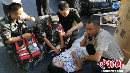 中新網(wǎng)烏魯木齊7月17日電(張森 程鵬翔) 新疆伊寧市花果山路路口16日發(fā)生了一起車禍,造成一名中年婦女受傷倒地不起。正在附近執(zhí)勤的武警官兵發(fā)現(xiàn)這一情況后,及時(shí)伸出援手進(jìn)行救治。