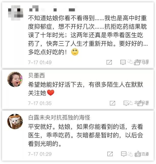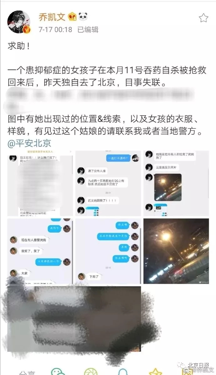 7月17日零點18分,知名博主@喬凱文 發博“求助”,稱一名患抑郁癥的女孩獨自到了北京,目前失聯中。據他了解,該女孩在7月11日曾經吞藥自殺未果。