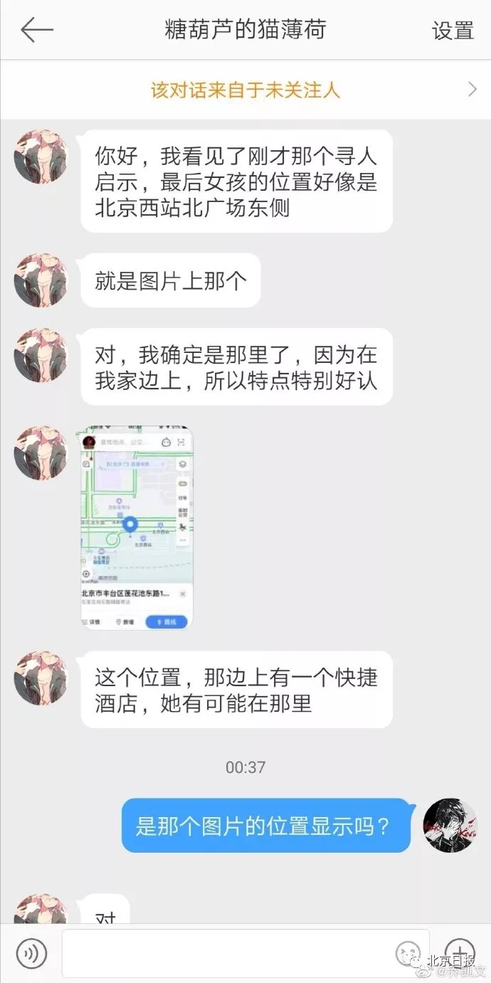 他在接受記者采訪時表示,當時看到博主發的尋人啟事后,發現配圖的地點很像北京西站北廣場東側。