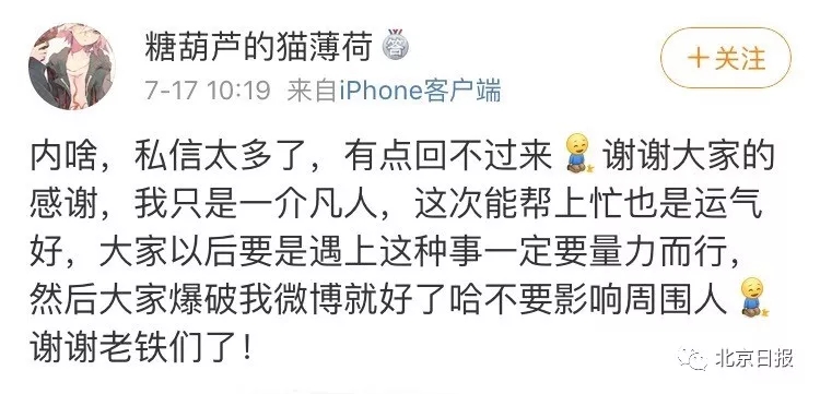 今天早晨,@糖葫蘆的貓薄荷 的微博私信“爆”了。很多網友特意去他的微博主頁,對他的熱心之舉表示感謝。