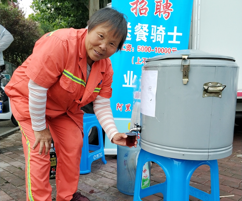 環衛工飲用免費酸梅湯。李鵬/攝