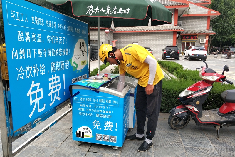 7月12日是“三伏天”第一天,城市進入一年之中最熱的時候。當天,筆者走訪安徽省亳州市區主要街道,見到不少為環衛工、快遞員等高溫作業的群體提供礦泉水、冰棍以及其他形式的“愛心水站”,為他們消暑降溫,讓他們過一個“低溫度”的夏天。