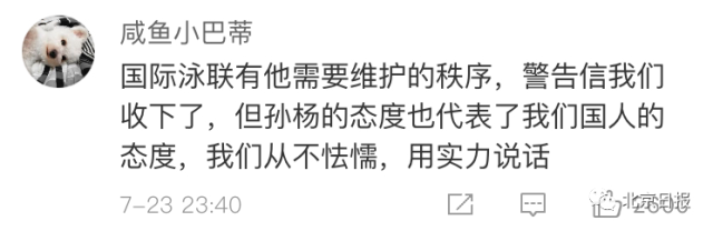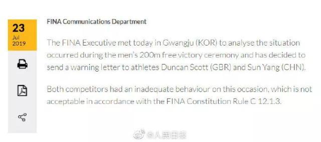 據人民日報客戶端,國際泳聯23日發聲明表示,在韓國光州舉行會議,分析23日男子200米自由泳頒獎儀式期間發生的情況,并決定向英國運動員鄧肯·斯科特和中國運動員孫楊發出警告信。兩位運動員在頒獎儀式期間都有舉止不當的行為,違反了國際泳聯章程規則C12.1.3。