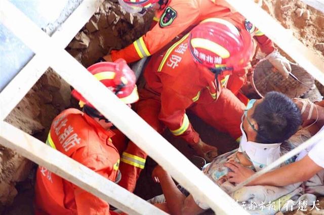 消防救援人員到場后發現,被困工人腰部以下被泥土掩埋,耳鼻口多處流血,意識模糊,坑道邊緣碎石和泥土不斷滾落,工人隨時有被掩埋的可能。危急關頭,五名消防員立即跳入坑中,一人抱住工人往上提,三人用身體抵住崩塌的泥土,一人用手去刨工人的雙腿,其余救援人員立即對坑道邊緣進行加固,一場向死神“搶奪”生命的賽跑緊張展開。