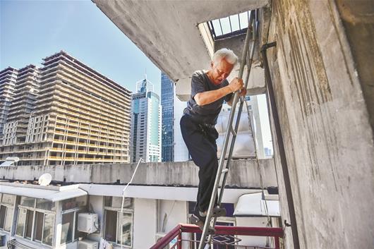 圖為:劉仁勝頂著烈日爬上爬下檢查樓頂?shù)乃?/p>