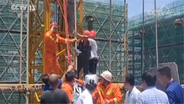 消防人員到達現場后發現,4名工人被困在塔吊平臺上,有3人手腳受傷,無法動彈。其中1人因長時間暴曬嚴重脫水,已經出現了意識模糊的狀況。消防人員爬上塔吊平臺,先給被困人員穿好全身安全吊帶,固定好腰部、胸部、肩部等部位,然后用安全繩將工人放到地面。