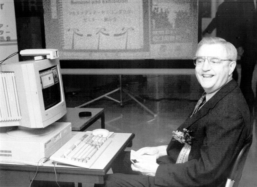 1996年2月9日,美國(guó)駐日本大使沃爾特·蒙代爾在計(jì)算機(jī)上為世界多媒體技術(shù)研討與博覽會(huì)開幕式進(jìn)行模擬剪彩。(新華社發(fā))