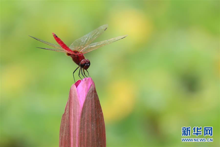 8月1日,在緬甸仰光,一只蜻蜓停在一朵含苞待放的荷花上。 新華社發(fā)(吳昂 攝)
