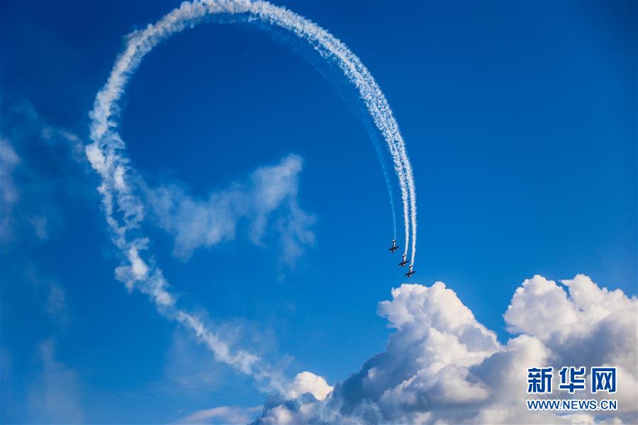 8月3日,在波蘭東北部的吉日茨科,飛行表演隊(duì)在馬祖里航展上表演。 當(dāng)日,一年一度的馬祖里航展開幕。 新華社記者 陳序 攝
