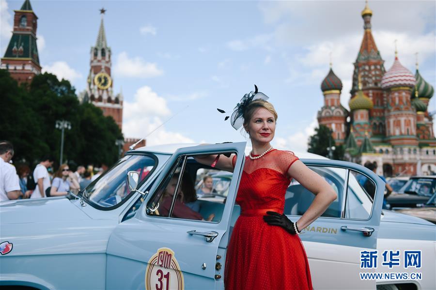 7月28日,在俄羅斯莫斯科紅場,一名女士在老爺車前留影。 當(dāng)日,莫斯科老爺車?yán)愒谑兄行拈_賽。 新華社發(fā)(葉甫蓋尼·西尼岑攝)