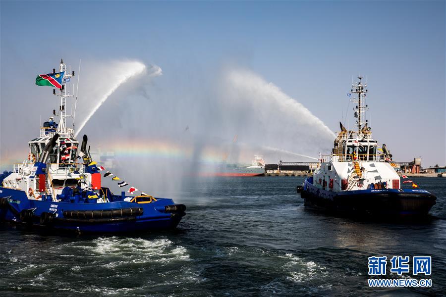 8月2日,在納米比亞沃爾維斯灣新集裝箱碼頭竣工儀式上,消防船用水柱搭建起“水門”慶祝。 沃爾維斯灣港是西南非洲國家納米比亞的重要港口,由中國港灣承建的新集裝箱碼頭建造在填海而成的40公頃土地上。而5年前,這里還是一片海水。新碼頭的竣工,使集裝箱處理能力由每年35萬個(gè)集裝箱增至75萬個(gè)。 新華社記者 張宇 攝