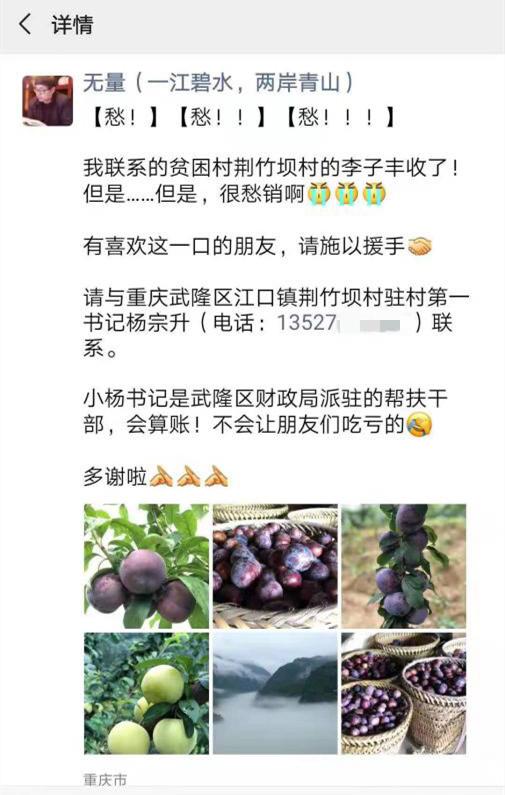 “愁!愁!愁!我聯(lián)系的貧困村荊竹壩村李子豐收了!但是……但是,很愁銷啊!有喜歡這一口的朋友,請施以援手!”7月10日,張倵瑃聽說李子滯銷心急如焚,毫不猶豫發(fā)了一條朋友圈。他在朋友圈附上了楊宗升的聯(lián)系方式:“小楊書記是武隆區(qū)財(cái)政局派駐的幫扶干部,會(huì)算賬!不會(huì)讓大家吃虧的,多謝啦。”