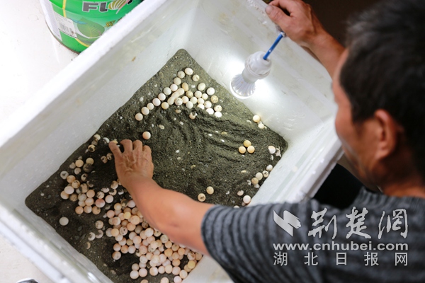 圖為張力觀察甲魚蛋孵化情況。  通訊員 朱本雙 攝