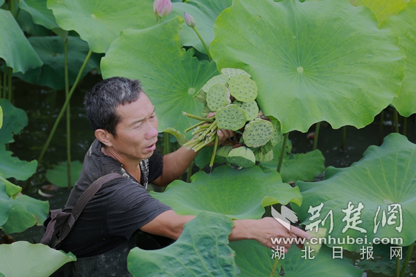 荊楚網客戶端—荊楚網消息 (通訊員 朱本雙) 8月6日,張力正在采摘蓮蓬,用地籠套捕小龍蝦。