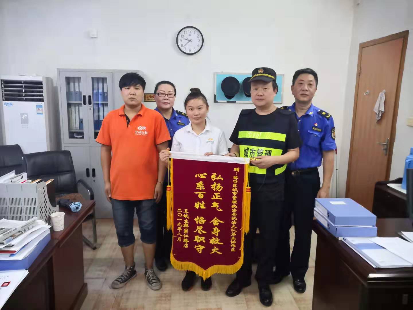 (通訊員趙志宏陶媛) “城管協(xié)管員楊忠權(quán)不顧危險挺身而出,感謝幫超市救火化險避損的見義勇為之舉”, 8月12日上午,身在北京的衛(wèi)斌超市連鎖店總老板王某,致電武漢市硚口區(qū)城管執(zhí)法大隊第三協(xié)作區(qū)中隊長王東平表示感謝,并委托該分店店長,給硚口城管執(zhí)法大隊贈送錦旗。王老板同時代表該店全國各分店承諾——嚴格服從配合分店所在城市的城管部門:自律出店經(jīng)營、履行好“門前三包”,落實好垃圾分類……….