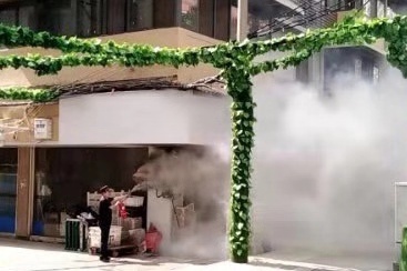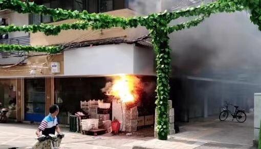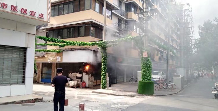 “是變壓器短路了,大家別害怕”正在該處執(zhí)勤的硚口城管執(zhí)法大隊第三協(xié)作區(qū)協(xié)管隊員楊忠權(quán)判斷出險情的原因,快步靠近該店,沖著店內(nèi)人群喊到,他一邊大聲讓店員把顧客排隊,盡量往離高壓開關(guān)較遠的一側(cè)按秩序快速跑出來,避免蜂擁而出形成“人栓”堵門。由于該店滅火器存放點距離電火花閃爍的高壓開關(guān)很近,大家擔心觸電而不敢靠近去取,怕有危險。老楊一邊跑到隔壁省腫瘤醫(yī)院漢口分院“借”來兩個干粉滅火器,此時高壓開關(guān)上方的木質(zhì)屋檐已經(jīng)燃起了大火,他再次沖進濃煙中,對準正在火花四濺的著火部位進行噴射……..