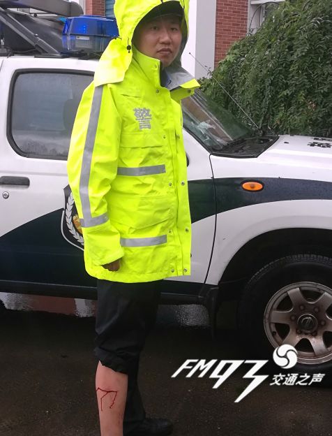 8月10日下午,嘉興高速交警支隊(duì)一大隊(duì)民警唐亞武正在處理第三起事故,從早上8時(shí)上崗已經(jīng)連續(xù)在狂風(fēng)暴雨中堅(jiān)守了6個(gè)多小時(shí)。由于路面過(guò)于濕滑,一輛事故車嚴(yán)重破損的金屬殘片深深劃過(guò)了他的小腿,馬上就流血了。