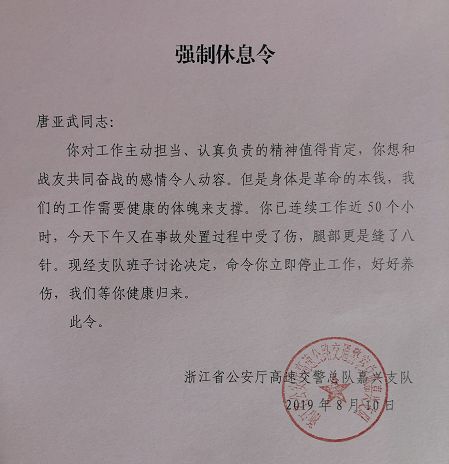 其實(shí)在臺(tái)風(fēng)“利奇馬”來(lái)臨之前,唐亞武已經(jīng)連續(xù)上了好幾個(gè)夜班,10日受傷、縫針后又一定要堅(jiān)持執(zhí)勤。為此,在10號(hào)晚間,高速交警嘉興支隊(duì)支隊(duì)長(zhǎng)章偉,政委駱淵以支隊(duì)班子的名義向他發(fā)出了強(qiáng)制休息令,要求他必須在家休養(yǎng),等傷勢(shì)好了之后再重新投入工作。