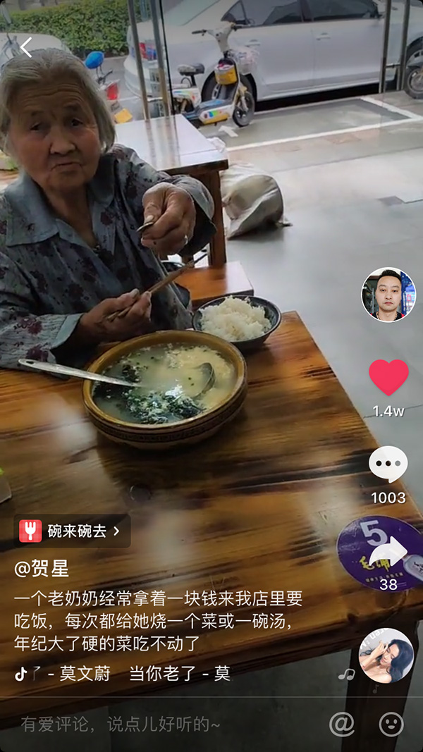 時(shí)間久了,老太知道賀星對她不反感,就時(shí)常來店里,也不再掏1塊硬幣,而賀星夫妻倆也早已習(xí)慣關(guān)照這個(gè)85歲的老太。據(jù)賀星稱,有時(shí)老太還會(huì)對他說,自己想吃肉。為此,賀星會(huì)給她燒獅子頭、紅燒肉等口感軟和的菜。老太每次都吃飽之后,都會(huì)將剩下的飯菜打包帶走。 6月下旬的一天,老太又一次到店里吃飯,賀星將老太吃飯的樣子拍成視頻,配發(fā)了一段文字:一個(gè)老太太經(jīng)常拿著一塊錢來我店里要吃飯,每次都給她燒一個(gè)菜或一碗湯,年紀(jì)大了硬的菜吃不動(dòng)了。背景音樂里響起來了歌曲《當(dāng)你老了》。