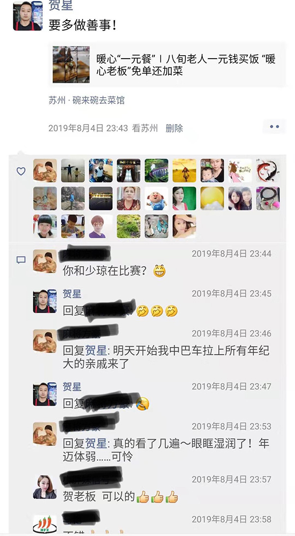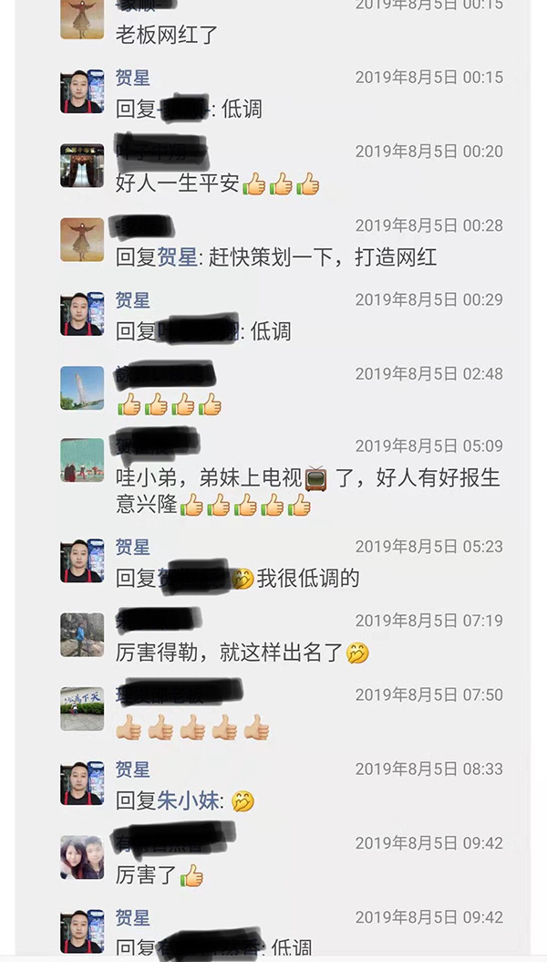 不過,“火”了之后的賀星的生活確實(shí)發(fā)生了改變。他和妻子出門買菜的時(shí)候,總會(huì)有攤主主動(dòng)上前來跟自己打招呼,更多的人向自己傳達(dá)著善意和對自己行為的夸贊。