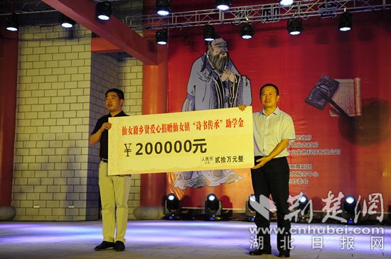 鄉(xiāng)賢代表向仙女鎮(zhèn)“詩書傳承”助學(xué)金委員會捐贈助學(xué)金啟動資金20萬元。(劉康 攝)