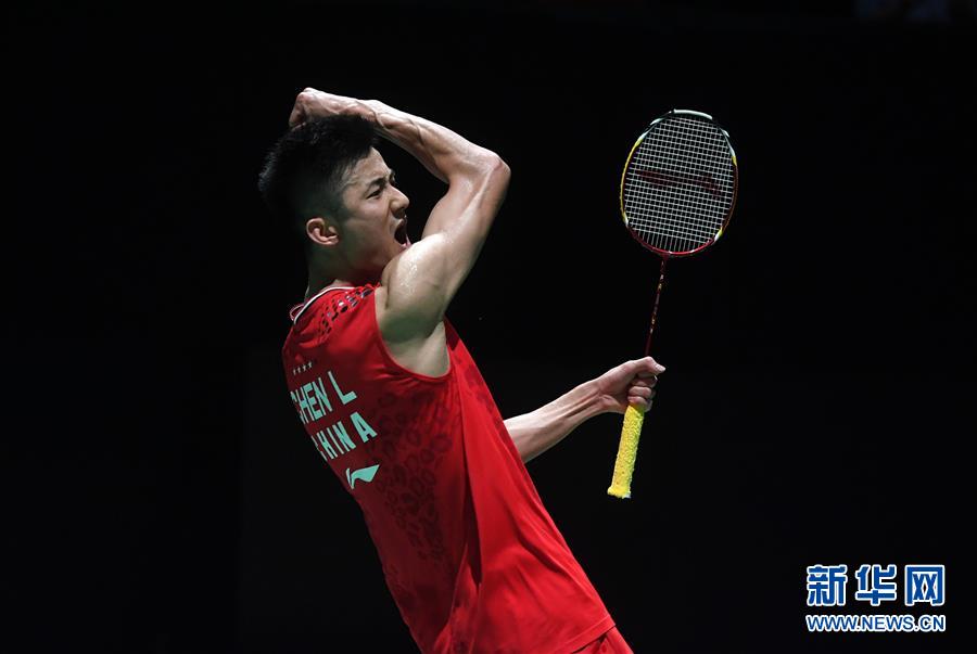 8月22日,中國選手諶龍在比賽中慶祝得分。 當日,在瑞士巴塞爾舉行的2019年世界羽毛球錦標賽男子單打第三輪比賽中,中國選手諶龍以2比1戰勝中國香港選手伍家朗,晉級八強。 新華社記者李俊東攝