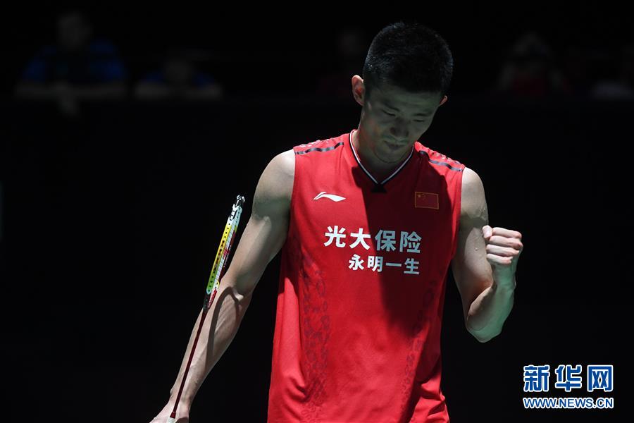 8月22日,中國選手諶龍慶祝勝利。 當日,在瑞士巴塞爾舉行的2019年世界羽毛球錦標賽男子單打第三輪比賽中,中國選手諶龍以2比1戰勝中國香港選手伍家朗,晉級八強。 新華社記者李俊東攝