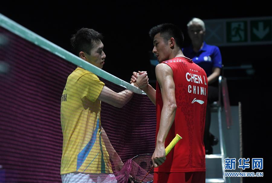 8月22日,中國選手諶龍(右)在比賽后與中國香港選手伍家朗致意。 當日,在瑞士巴塞爾舉行的2019年世界羽毛球錦標賽男子單打第三輪比賽中,中國選手諶龍以2比1戰勝中國香港選手伍家朗,晉級八強。 新華社記者李俊東攝