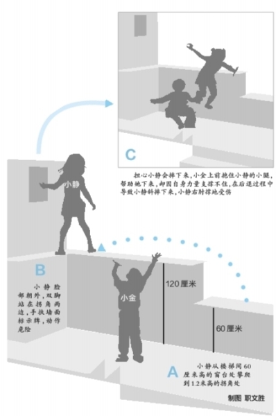 2018年10月26日下午3時許,小金和小靜在學(xué)校教學(xué)大樓樓梯間玩耍。小靜從樓梯間60厘米高的窗臺處攀爬到1.2米高的拐角處,臉部朝外,雙腳站在拐角兩邊,手扶墻面標(biāo)示牌,動作危險。