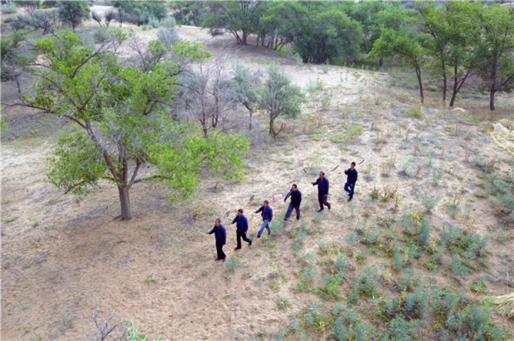 在甘肅省武威市古浪縣八步沙林場(chǎng),場(chǎng)長(zhǎng)郭萬(wàn)剛(左一)和大家一起前往治沙點(diǎn)(8月23日無(wú)人機(jī)拍攝)。新華社記者 范培珅 攝