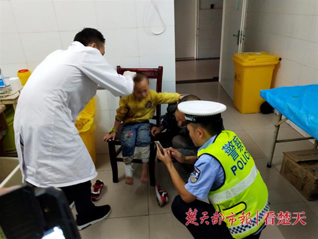 民警發現,幼童頭部和腳骨明顯受傷,執勤民警一邊安撫小孩情緒,一邊駕駛警車將小孩送往附近醫院救治。