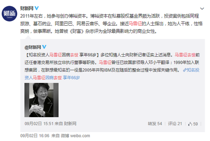 對于馬雪征去世一事,聯想集團董事長兼CEO楊元慶通過微信朋友圈哀悼:“驚聞Mary突然去世的消息,震驚,哀痛,無以言表!相識近30年,她曾是并肩打贏一場場硬仗的戰友,也是完美平衡職業和生活的良友。在聯想歷史上,Mary的名字早已銘刻其中。或許,最好的告別是永記。Mary的優雅、大氣、智慧、果敢、堅韌,還有爽朗的笑聲,將永留心中。一路走好!”
