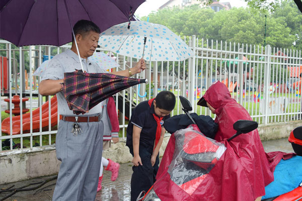 這張照片的拍攝地點是在江蘇省張家港市萬紅幼兒園門口。路邊,一位小學生正奮力地脫掉身上的雨衣和雨鞋,穿著雨披的奶奶在電動車上也在幫忙。這時,一位老大爺站在了祖孫倆的身邊,伸長手臂,把雨傘打在了他們的頭頂。拍攝照片的褚珊珊說,昨天她剛好路過,看到了這一幕。