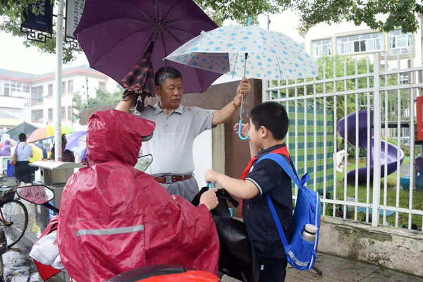 9月2日是開學第一天,在江蘇省張家港市萬紅幼兒園附近,一位七旬老人為一對素不相識的祖孫倆撐傘的照片,溫暖了很多人……
