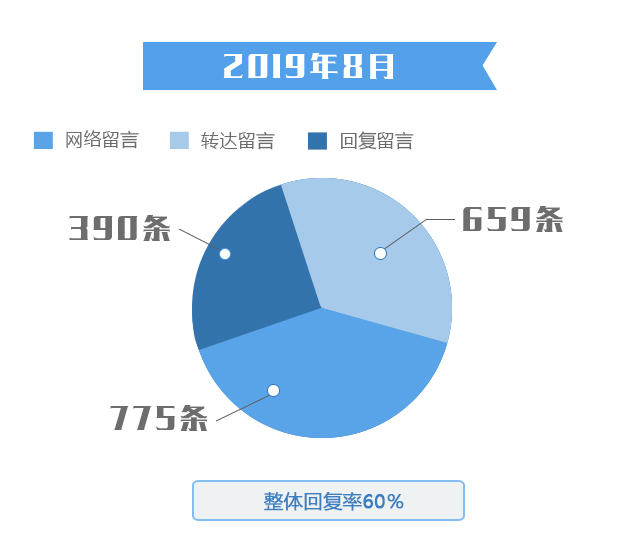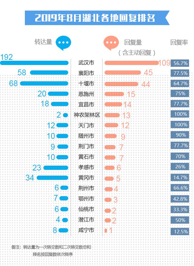 8月1日至31日,《荊楚問政》共收到 241條留言,其中有效留言190條,欄目組已經向相關部門轉交175條留言,含二次轉交留言 1條(荊楚網《荊楚問政》欄目正在將此前未回復的留言進行二次轉交), 84條留言獲得相關部門回復。