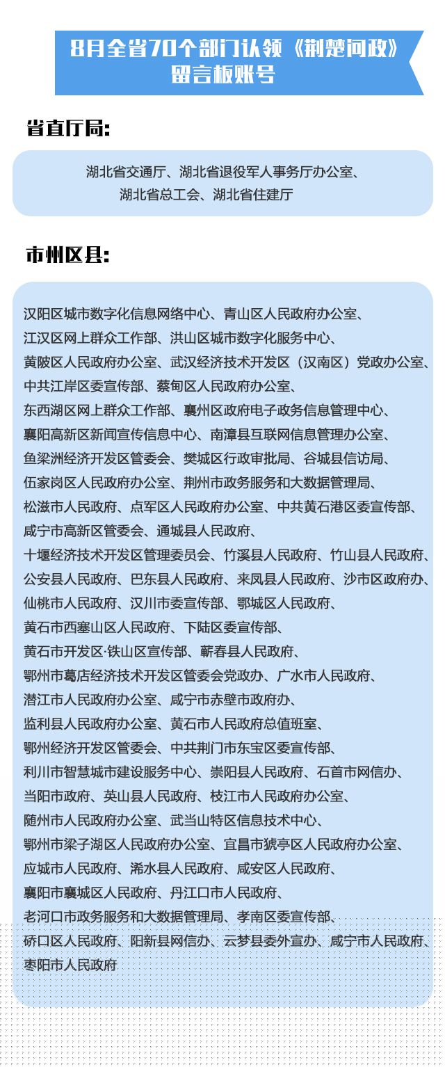 8月,湖北省住建廳、東西湖區網上群眾工作部、蔡甸區人民政府辦公室、咸安區人民政府、襄陽市襄城區人民政府、丹江口市人民政府、老河口市政務服務和大數據管理局、孝南區委宣傳部、硚口區人民政府、陽新縣網信辦、云夢縣委外宣辦、咸寧市人民政府、棗陽市人民政府等單位認領了《荊楚問政》平臺賬號。